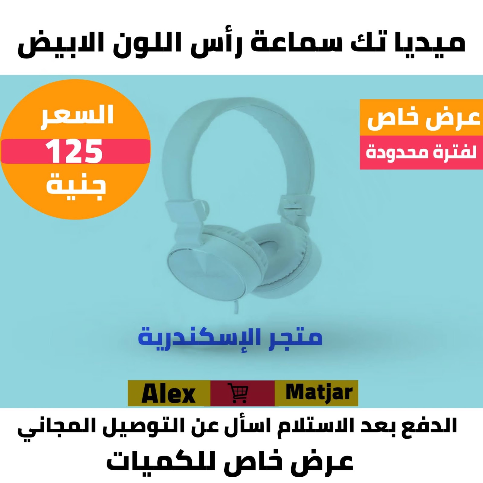 سماعة ميديا تك سماعة رأس اللون الابيض الان بسعر خاص جداً ولفترة محدودة علي متجر الاسكندرية بسعر 125 جنية مصري . افضل وارخص سماعة رأس موجود...